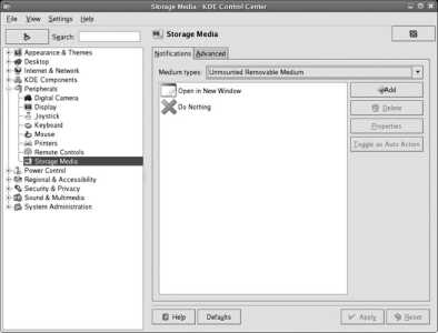 Select Unmounted Removable Medium in the "Medium types" menu. Two actions will be displayed: "Open in New Window," which mounts the drive and opens a Konqueror browse window, and Do Nothing, which causes a drive icon to be displayed on the desktop, which, when clicked, will mount and browse the drive.