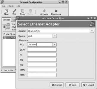 If the device is not in the list, select Other Ethernet Card from the bottom of the list and click Forward. The window shown in Figure 3-9 will appear; select the Adapter type (which selects the device driver to be used), the device name to be used (the default is usually OK), and any resources the card will use (this area should almost always be left blank). Click Forward.