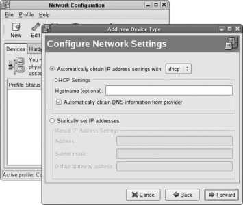 All of the Ethernet devices that have been automatically detected (or previously configured manually) will be listed, with the device name in parentheses (such as eth0 ). Select the device you wish to configure and click Forward.