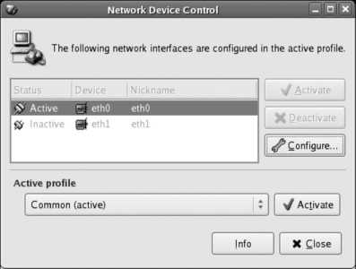 To change profiles, select the desired profile from the pull-down menu, and then click on the Activate button. The list of configured network interface devices will change to reflect the interfaces configured as part of the selected profile. Interfaces that are part of the profile but that cannot be activated or deactivated by ordinary users will appear in the interface list, but will be grayed out and unselectable.
