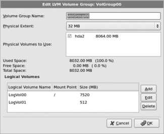 To make these changes, double-click on the line in the table that reads VolGroup00 and then click the Edit button. The Edit LVM Volume Group window will appear, as shown in Figure 1-19 .