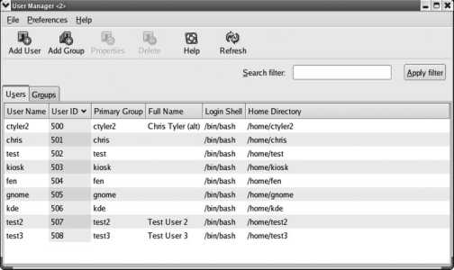 system-config-users rootFigure 4-8. The Users and Groups configuration window