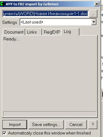Если у Вас стоит Any to FB2 в меню Файл/Импорт щелкните по вставке ANYFB2 dy GribUser откроется окно: