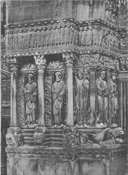 Вполне нормальных пропорций фигуры апостолов чинно выстроились между колонками с коринфскими капителями. Нам ясно, что ваятель имел перед глазами древнеримские статуи философов и риторов. Нет динамизма, нет взволнованности, но зато есть желание приблизиться к спокойному благородству античных форм, впрочем не всегда достигающее своей цели: «варварская» грубоватость ведь еще не изжита.
