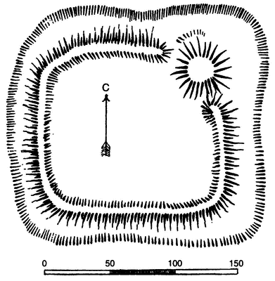 Несмотря на то что обычай возводить крепости или замки для частных владельцев был введен в Англии завоевателями-норманнами, несмотря на то что именно при них земляные укрепления достигли своего уровня наивысшего развития, нельзя исключить, что истоки этого искусства не только для Нормандии и Англии, но и для Дании следует искать на земле франков. Датский geweorc или бург (там, где удалось с уверенностью доказать, что речь идет именно об этом виде укреплений, а это происходило лишь в редких случаях) включал в себя места для размещения воинов, иногда гавань для кораблей, но никогда укрепления, принадлежавшего отдельному вождю. Земляное сооружение под названием замок Ганнок (рис. на с. 52), расположенное на берегу реки Уз близ Темпсфорда, иногда принято считать укреплением (geweorc), построенным датчанами в 921 г. По своей структуре оно очень напоминает небольшой замок «мотт и бейли», обычный тип ранних замков нормандцев, которые могли вместить лишь малое число защитников. В то же время оно отличается от замков этого типа тем, что невысокий холм, по сути, представляет собой всего лишь немного утолщенный земляной вал, у основания которого отсутствует ров. Это свидетельствует о том, что датчане сумели несколько опередить своих нормандских последователей в применении архитектурного плана, с которым они, возможно, сумели ознакомиться во время своих грабительских набегов на земли Франции. Однако это является всего лишь предположением, тем более что остаются не вполне понятными непосредственные цели, с которыми такие крепости возводились датчанами .