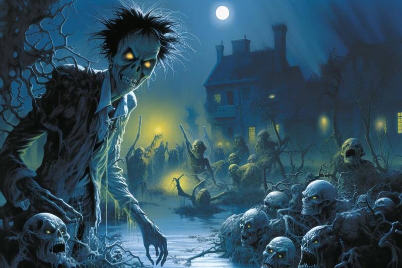 А здесь Проблембо не поняла запрос и выдала такой прекрасный и живописный зомби-ужастик, что я даже поправлять не стал. Дивно же! Только взгляните, какой джентльмен на переднем плане! Небось, ещё утром кофе с растительным молочком пил, скучал и маялся нудной офисной жизнью! И какие саркастические взгляды у черепов нет, дивно!
