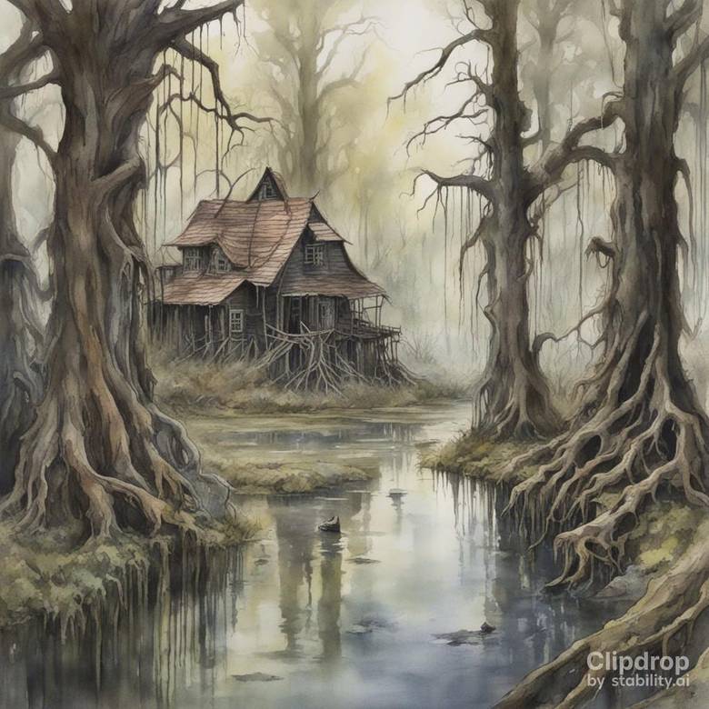 В промте «акварель, болото, брызги, течёт и капает, загадочные существа».