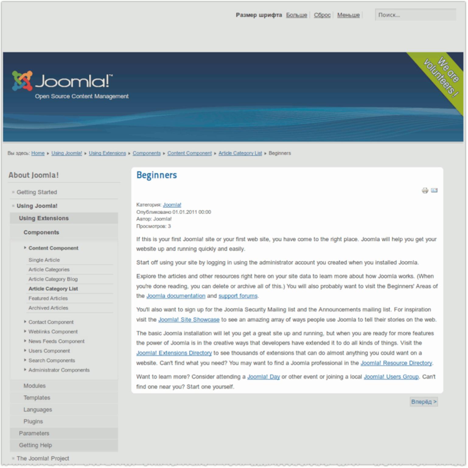 На странице, выводимой Joomla, может быть одна статья, а может быть несколько, выводимых перечнем. После установки Joomla, на главной странице сайта вы увидите четыре статьи (рис. 5).