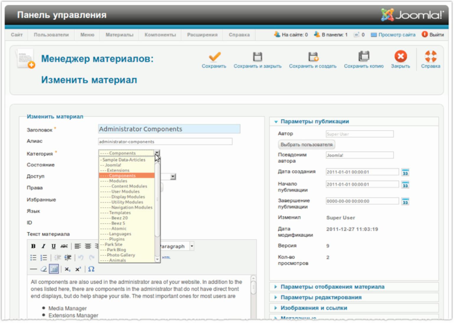 Хранящиеся в базе данных статьи могут быть доступны или недоступны посетителям: опубликованы или сняты с публикации (кнопки «Опубликовать» и «Снять с публикации» в административном разделе). Статьи можно выводить на главную страницу, отправлять в архив, удалять и восстанавливать. Их также можно копировать и перемещать.