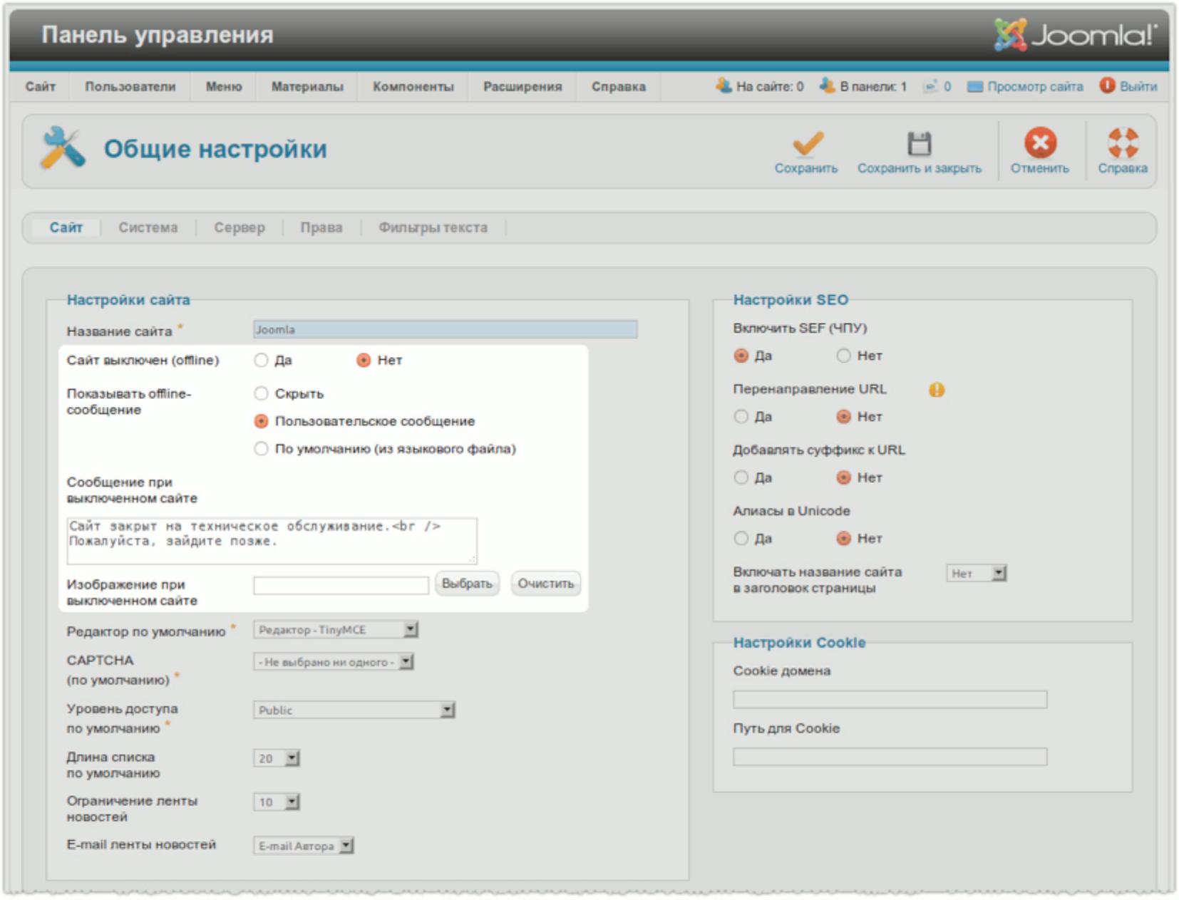 О том, что сайт, управляемый Joomla 2.5, временно не работает, посетителей можно предупреждать как при помощи стандартного сообщения, так и при помощи специально составленного. При необходимости вывод сообщения можно вообще отменить. В режим офлайн сайт можно перевести еще в процессе установки CMS, что позволяет сразу же ограничить доступ к нему неавторизованных посетителей. Помимо сообщения о перерыве в работе сайта может предупреждать еще и выбираемое администратором изображение.