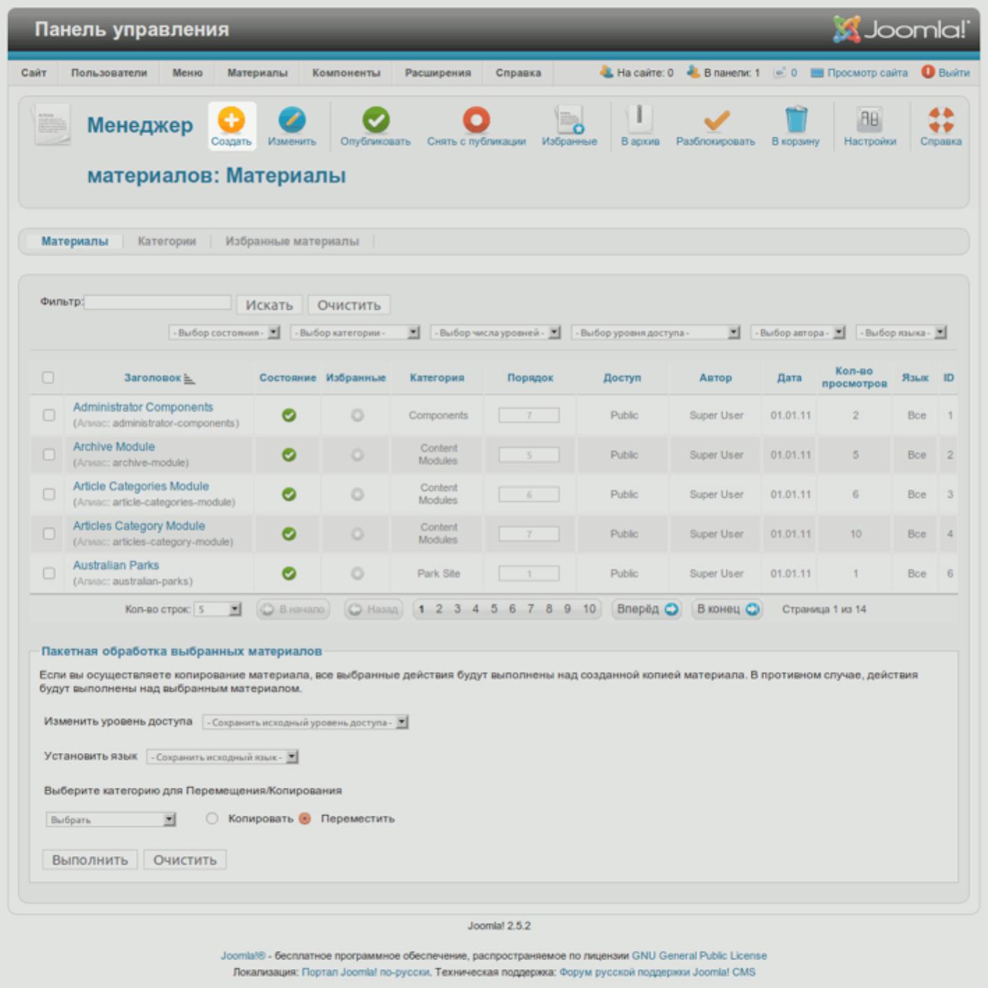 Откройте страницу менеджера статей (меню административного раздела пункт «Статьи»). Там вы можете увидеть демонстрационные материалы, снятые с публикации после установки сайта (рис. 1).