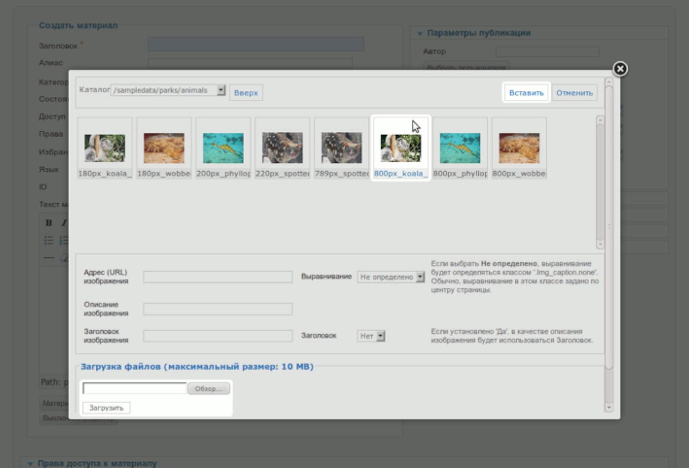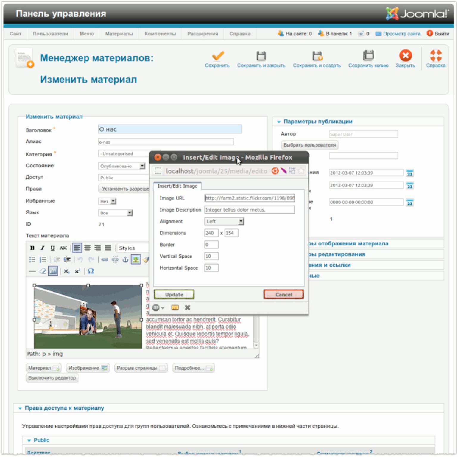 После загрузки и вставки изображения можно настроить параметры его вывода при помощи упомянутого ранее интерфейса, кликнув по соответствующей пиктограмме [описанная выше пиктограмма с картинкой] на верхней панели редактора. Наличие дополнительного интерфейса требуется в тех случаях, когда вместо установленного по умолчанию TinyMCE используется редактор без функции вставки изображений или статья создается без помощи редактора. Благодаря наличию кнопки изображение можно вставить вне зависимости от возможностей используемого редактора.