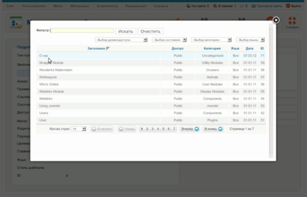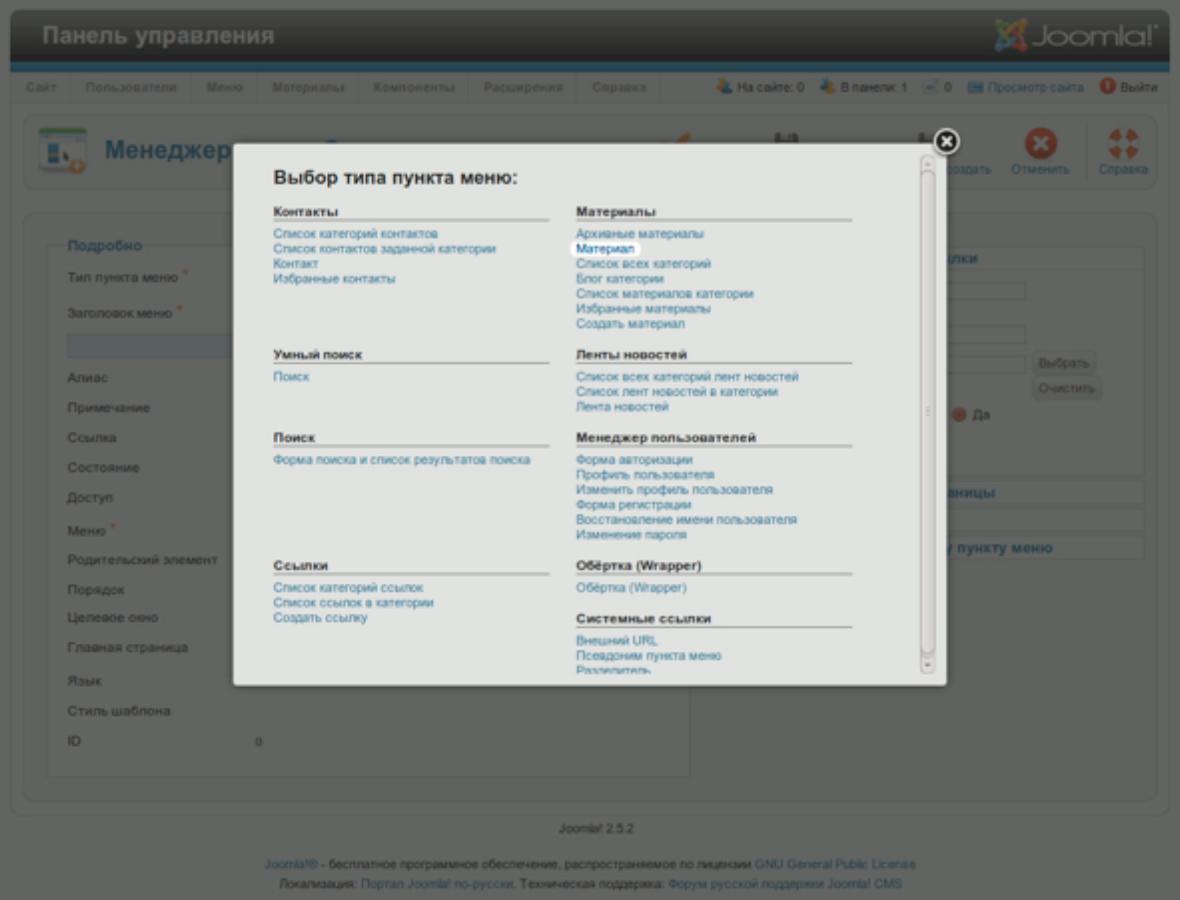 настройки верхнего меню (меню административного раздела пункт «Меню» подпункт «Верхнее меню» [«Top»]) кликните по пиктограмме с подписью «Создать». Маленькая подсказка: «Top» [в английском совпадает с названием верхнего меню] название посадочного места верхнего горизонтального меню в шаблоне по умолчанию. Если вы не пользуетесь вышеуказанным шаблоном или демонстрационных данных на сайте нет, то данного меню может не быть, а данная позиция может называться иначе. Кликните по кнопке «Выбрать» в поле «Тип пункта меню». Появится всплывающее окно со множеством ссылок. Кликните по ссылке «Материал» (рис. 5).