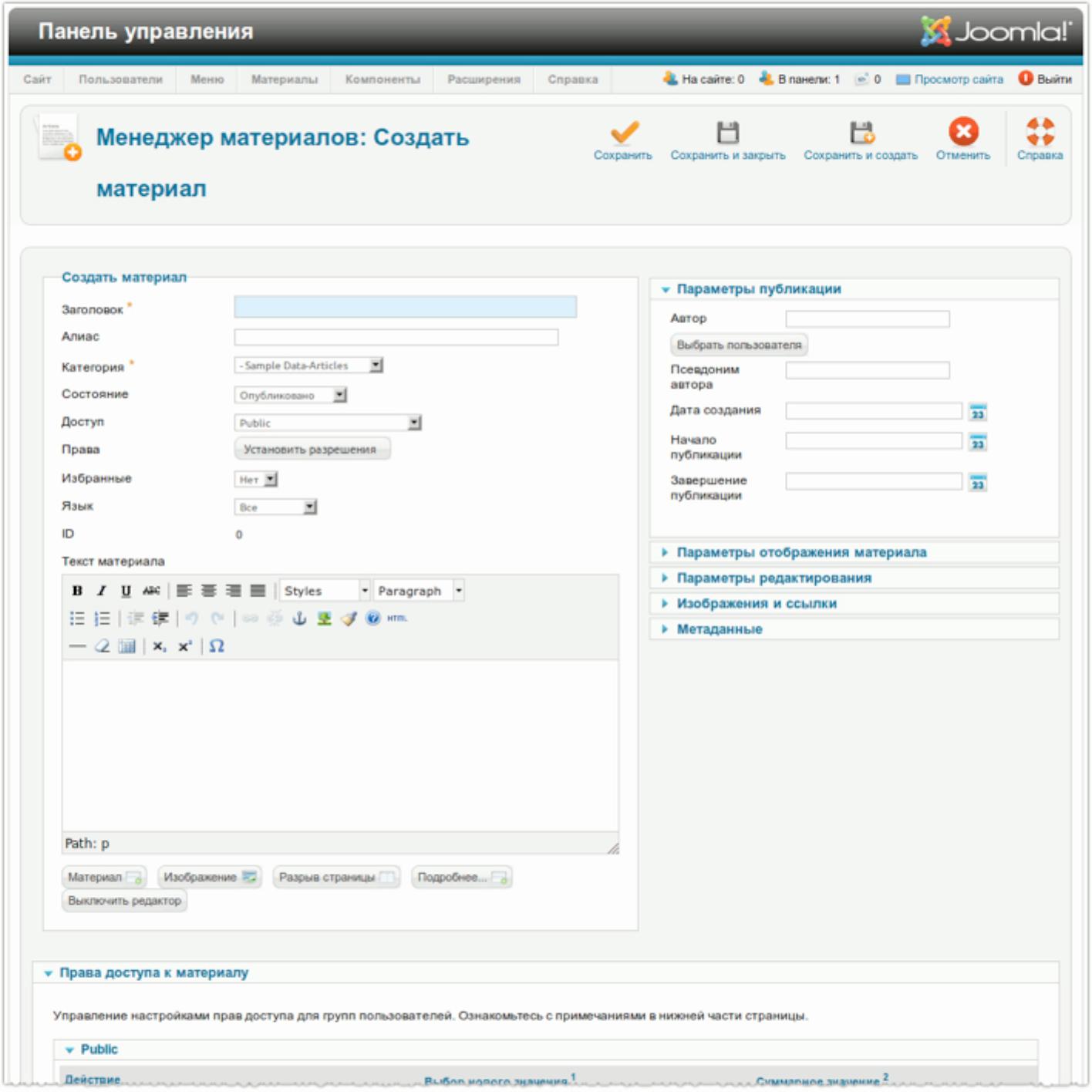 Кликнуть по кнопке «Сохранить и создать». В этом случае статья сохраняется, интерфейс редактирования перезагружается для создания новой статьи.