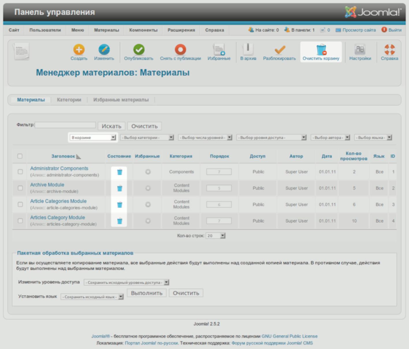 Если статья попадает сюда, ее еще можно восстановить. В корзину также можно перемещать модули, пункты меню, категории, записи контактных данных и прочее содержимое вашего сайта. Выделить «удаленные» статьи из общего списка можно при помощи фильтра [выпадающий список «Выбор состояния» над таблицей]. При переходе к списку «удаленных»