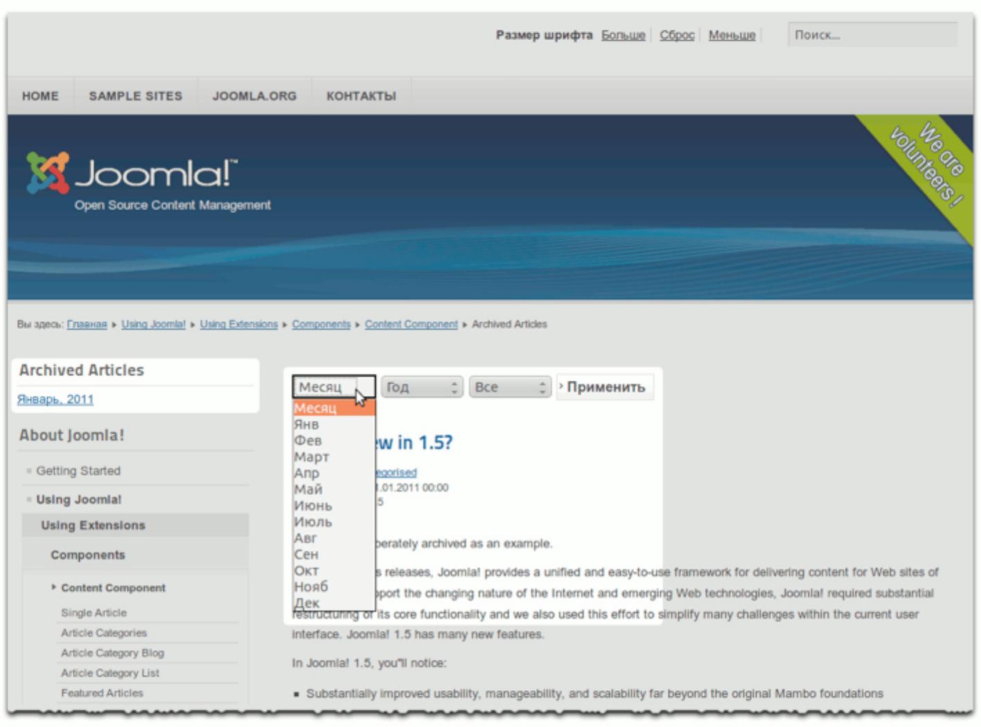 Настанет время, когда вы задумаетесь об архиве для статей. Создается он очень просто: почти все, что для этого нужно задать материалу соответствующее состояние. В базе данных Joomla хранятся даты создания статей [для сортировки в архиве]. Также в исходной комплектации Joomla есть модуль отображения архива на стороне посетителей. Он устанавливается вместе с демонстрационными данными. Если его нет, просто создайте его: меню административного раздела пункт «Расширения» подпункт «Менеджер модулей» пиктограмма с подписью «Создать» тип модуля «Материалы - Материалы в архиве». Архив будет отображаться на стороне
