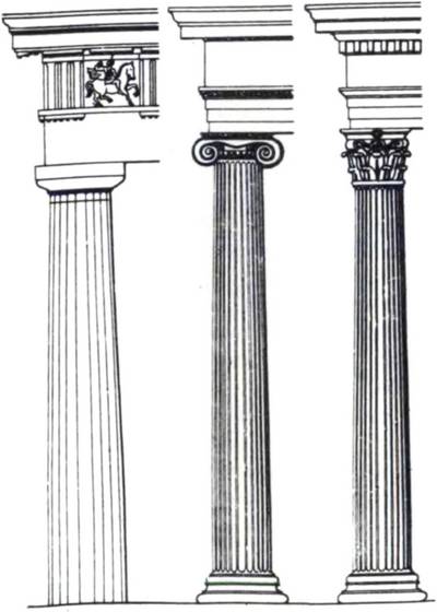 Дорическая колонна напоминает ствол дерева. Как дерево, она кажется растущей прямо из земли, выглядит мощной, немного тяжелой и слегка приземистой. Ионическая, поставленная на базу, производит впечатление более высокой и легкой. Разную форму имеют и их капители . Плоская каменная подушка дорической колонны поддерживает квадратную плиту, а у ионической та же подушка, как будто сделавшись мягкой, загибается на концах, образуя два крутых красивых завитка. Ионические колонны тоньше, стройнее и выше дорических.