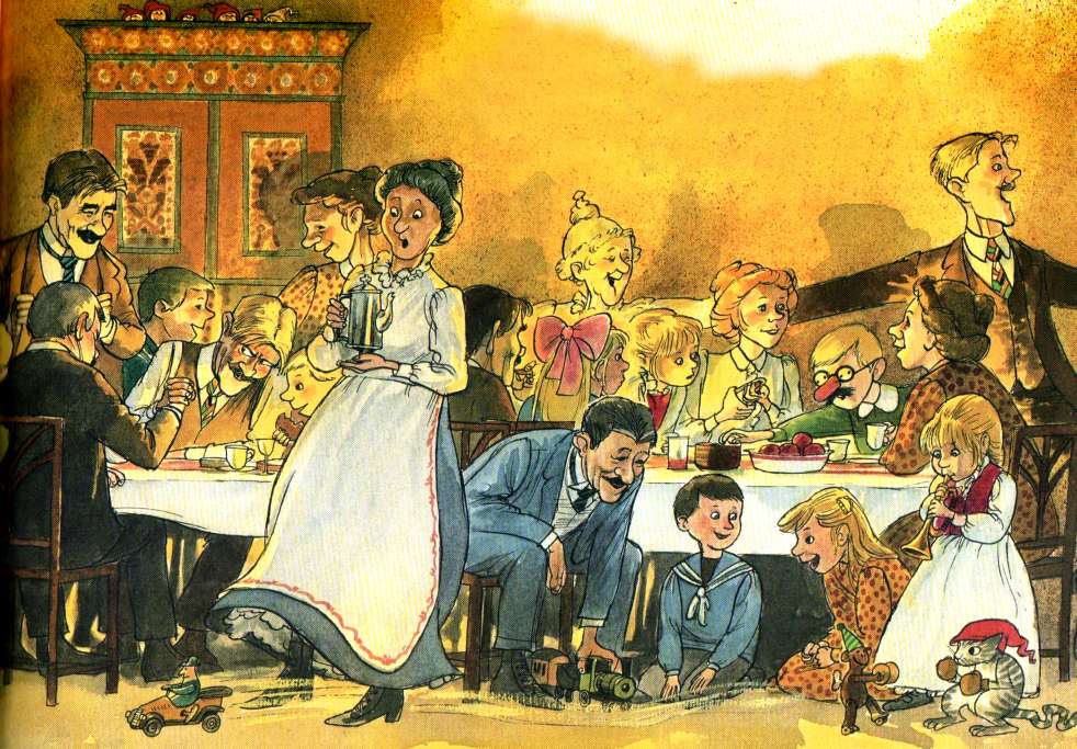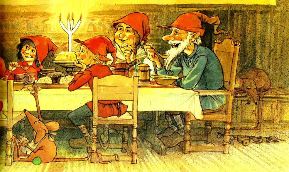 Они отлично знали, как проникнуть в дом и забраться на высокий шкаф в зале так, чтобы их никто не заметил. В доме было полно тайных дверей и переходов, известных только гномам и мышам. Рассевшись на шкафу, они стали смотреть на людей за праздничным столом.