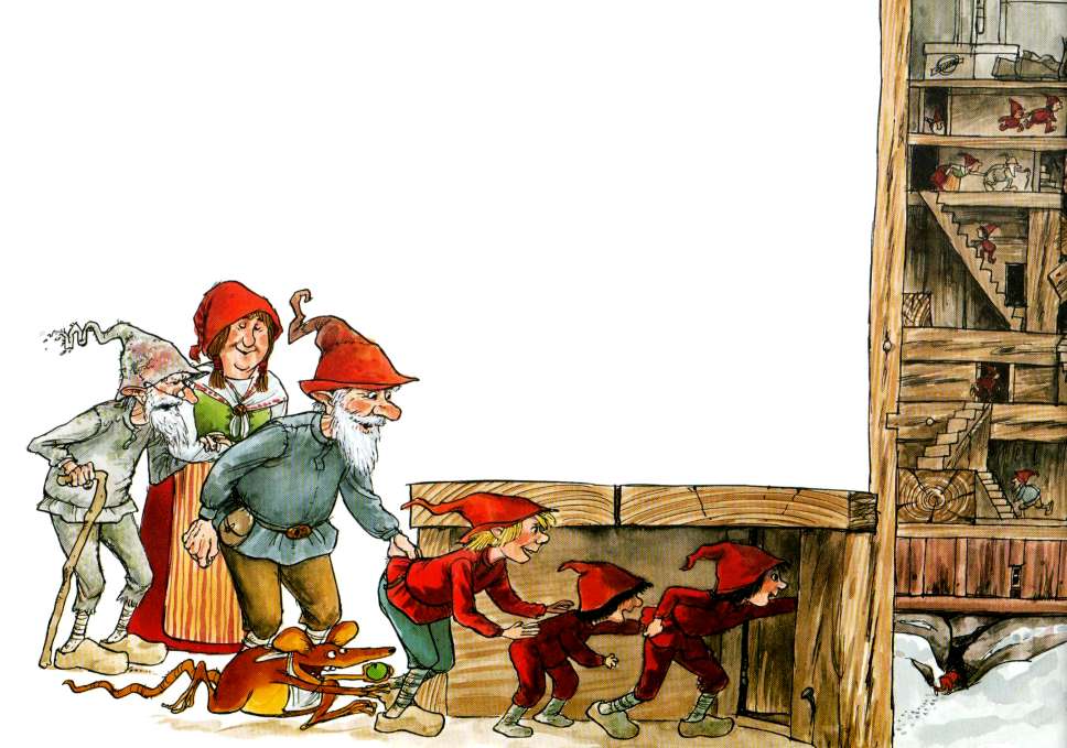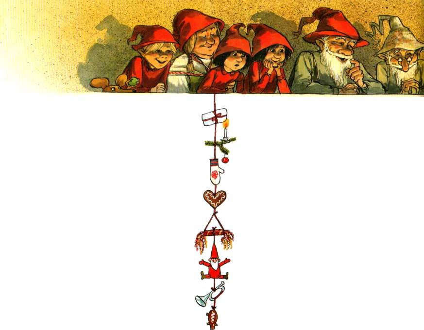 Праздник продолжался. Люди болтали, кололи орехи, разгадывали загадки и водили в хороводы. Они играли в жмурки и в игру, которая называется «Нарисуй свинье хвост». Дети забавлялись с новыми игрушками, а Оскар победил всех в армрестлинг. Время бежало вперед, а гномы все сидели на шкафу, наслаждаясь царившим в комнате весельем.