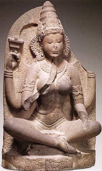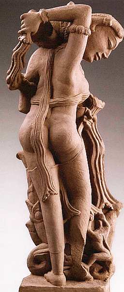 У ног полуобнаженной девушки обезьянка, она стягивает с ее бедер легкое покрывало. На этом примере хорошо видны основные черты индийской пластики: пропорции приземисты, отдельные части тела несоразмерно велики. Все сделано, чтобы подчеркнуть чувственность героини, ее тесную связь с окружающим миром. Изысканная и скрупулезная резьба орнаментов и деталей туалета сочетается с лаконичной трактовкой лица. Древним мастерам был важен не портрет, а узнаваемость типа.