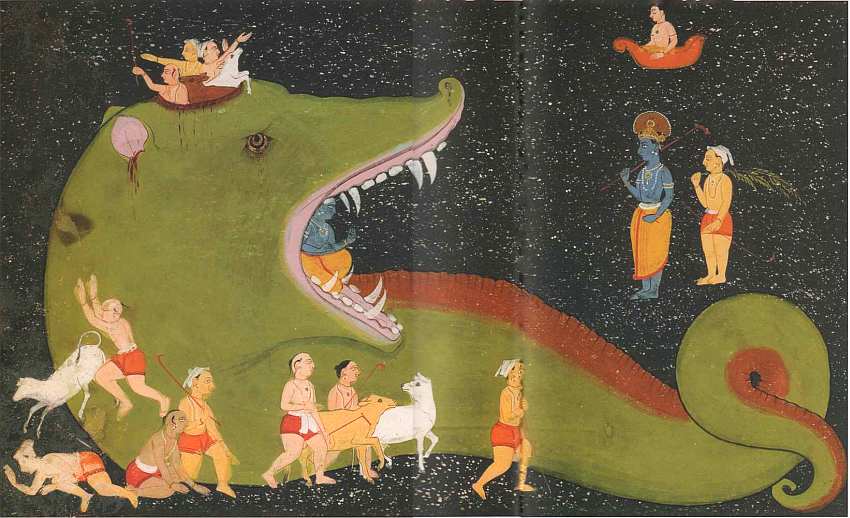 Эта акварельная работа впечатляет свежестью красок и оригинальностью образов. Здесь в светло-зеленом цвете с желтоватым оттенком изображено морское чудовище, демон Агасура. Сцена взята из многочисленных описаний приключений Кришны в юношестве. Он вошел в пасть монстра и вырвал ему сердце. Мастер изображает бога дважды в открытой пасти демона и в правой части листа, стоящим рядом со своим братом Баларамой. По обычаю, Кришну представляли мальчиком или молодым человеком. Кожа бога синего цвета, потому что с санскрита его имя переводится как «Черный или темно-синий». В поэзии традиционным стало сравнение облика Кришны с цветом облаков. Действие происходит в темноте, очень оригинально смотрятся яркие тона на мерцающем звездном фоне.