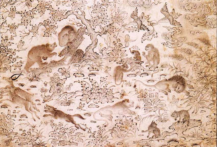 Этот лист дает представление о синтетическом характере исламо-китайской графики. Способ расположения животных очень свободен, тонкие контуры и штриховка говорят о китайской составляющей. Также обращает на себя внимание характерная для этой азиатской культуры трактовка сухих сучковатых стволов деревьев и изящных завитков облаков. Заполненность страницы и панорамная точка зрения, в свою очередь, исламский компонент. Стремление к сплошной орнаментальности и интерес к изображению беззаботного досуга сочетаются со сценами погони и охоты. Художник словно доносит до зрителя, что за каждой игрой может скрываться конкуренция, в мире царят борьба и соперничество, а также вечное противостояние сильных и слабых, мужчин и женщин. Работа предположительно приписывается одному из известных мастеров того времени Мухаммаду Сиях Каламу, из-за схожести манеры компоновать сюжеты и графического стиля. Однако многие историки искусства оспаривают реальность этого автора и считают, что произведения, подписанные названным именем, принадлежат целой группе творцов.