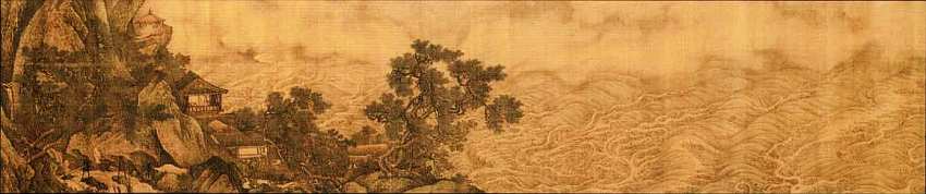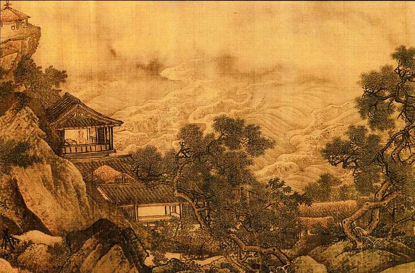 Свои композиции мастера традиционно выполняли на свитках. Слева участок с преобладанием темного: густой зелени деревьев, мрачных скал, приземистых домиков. Каждый предмет по отдельности уже маленькое произведение искусства. Справа открывается панорамный вид на покрытую дымкой долину, раскинувшуюся внизу. С легкостью можно представить одинокого человека, который выходит из дома и в задумчивости любуется ею. Тишина и простор оглушают зрителя. Притом в картине нет ничего застывшего, все будто обладает внутренней динамикой. Это еще одна отличительная черта китайской философии живописи: художники стремились выразить постоянную изменчивость природы.