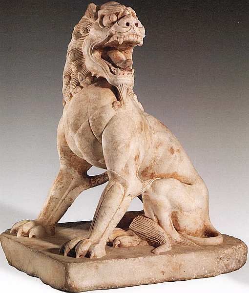 Скульптура того времени важнейшая часть буддийской храмовой архитектуры. Пластика достигла выразительности, энергичности выявления отдельных элементов (анатомии). Декоративность (стоит обратить внимание на трактовку гривы) сочеталась с потрясающей точностью и документальностью позы. Лев в буддизме традиционно символизировал защитника, а также аллегорически представлял самого Будду. Такие изваяния ставили у входа в священные места. Раскрытая в рыке пасть должна была отпугивать злых духов.