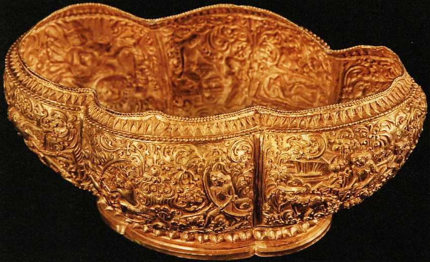 Данная емкость сделана из нескольких листов золота, скрепленных между собой. На ее стенках прочеканены различные сцены из Рамяны, в частности, рассказывающие о том, как принц Рама (главный герой эпоса) отправляется на поиски своей жены Ситы, которая была похищена Раваной (его противником). Действие разворачивается на фоне богатого растительного орнамента, он является основой декоративного оформления данной чаши. Технологические приемы, использованные при ее изготовлении, и уровень моделировки демонстрируют высокое развитие мастерства обработки благородных металлов в королевстве Матарам в X веке.