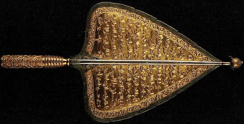 В этом предмете, как и во многих произведениях искусства Индонезии, соединились разные художественные и культурные традиции. Так, он имеет листовидную форму, называющуюся гунунган, характерную для специальных декораций традиционного индонезийского теневого театра вайанг. Такими декорациями изображали горы или другие пейзажи, поэтому гунунган переводится как «гора». В то же время на данном опахале прочеканена арабская благопожелательная надпись, в которой прародителем династии назван святой султан Искандер Зулькарнай. Очевидно, можно по достоинству оценить претензии на древность рода султанов маленького острова, так как имя Искандер Зулькарнай значит Александр Македонский.