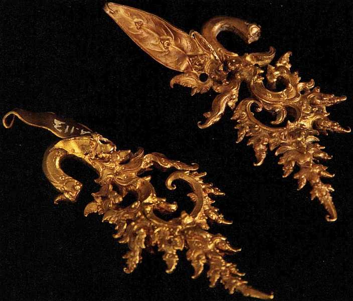 Фантастические листья отлиты в технике утраченной восковой модели; крючки, благодаря которым серьги закреплялись в ушах, отлиты отдельно и припаяны к ним.