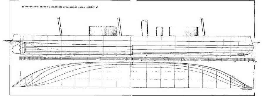 Вследствие этого сообщено департаменту, что башня для командира должна быть сделана на лодке «Смерч» круглая, около 4 1/2 фут диаметром внутри, с броней в 4 1/2 дюйма толщины, доходящей вплоть до железной палубной настилки и укрепленной на подкладке из двух рядов, а сам цилиндр рубки должен быть из 1/2 д. железа с угловым железом и с диагональными полосами по первому (внутреннему) ряду подкладки; отверстия (визиры) для наблюдения прорезать подобные тем, которые для этой же цели устроены в капитанской рубке