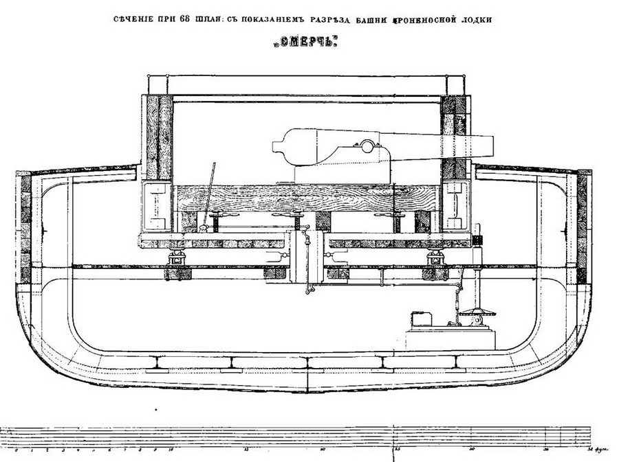 Двухбашенная броненосная лодка Смерч (Сечение в районе башни системы Кольза)