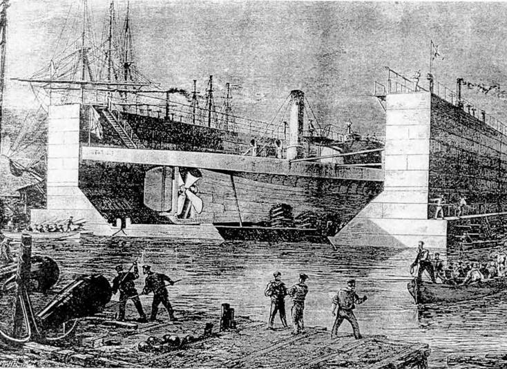 Однобашенный монитор в железном плавучем доке принадлежащем заводу Макферсона. Кронштадт 1860-е годы. С рисунка А.К. Беггрова.