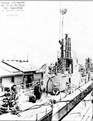Только совсем небольшое число подлодок получили полный комплект радиолокационных антенн, как показанная на фото «Mingo», 17.06.1945г. Зенитный радар SS последних лет выпуска заменил прямоугольную антенну SD большой овальной, предстваленной на снимке. Подъемная антенна теперь использовалась для дальней связи и заменила штыревую антенну, которая прежде использовалась для дублирования SD.