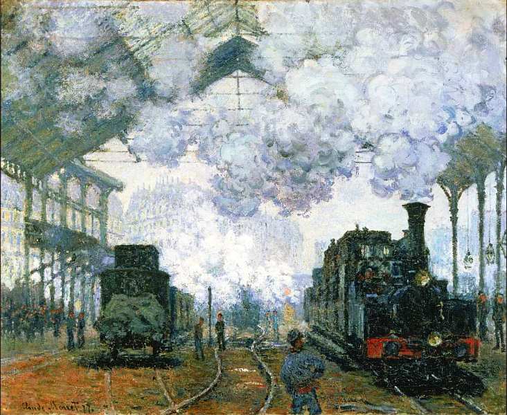 В данной картине мастеру интересны художественные возможности в передаче таких неэстетических объектов, как поезда, каркасные конструкции здания вокзала и железнодорожные рельсы. Стилистика этого полотна отвечает импрессионистической манере: точные небольшие удары-мазки, ограниченная цветовая гамма, стремление показать плотность клубов дыма. Особая атмосфера вокзала передана через почти сказочные голубые облака.