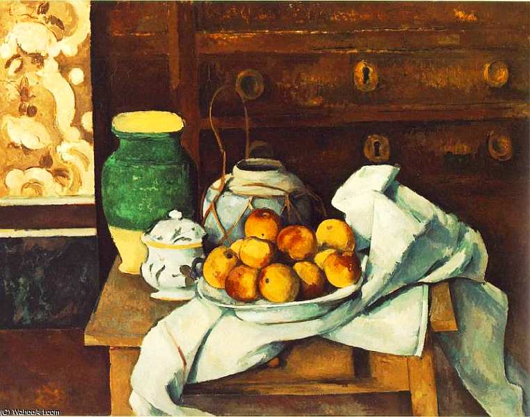 На картине представлена одна из традиционных и хорошо узнаваемых тем творчества Сезанна натюрморт с яблоками. При кажущейся простоте сюжета и его воплощения работа построена на сложном отношении к пространству, что и было, в конце концов, востребовано художниками-новаторами XX века. Изображен обычный натюрморт, однако пространство уже начинает становиться условным, предметы тяготеют к абстрактному исполнению, открывают прямой путь к экспериментам кубизма. Яблоки соответствуют всем канонам живописи последней четверти XX столетия они объемны и написаны в манере импрессионизма. Стол создан, кажется, уже не в классической прямой перспективе, а в обратной. Драпировка, которая по сей день присутствует в учебных работах студентов любой академии художеств, и ваза слева написаны условно-плоскостно. Очень похожий композиционно натюрморт с яблоками хранится в петербургском Эрмитаже.
