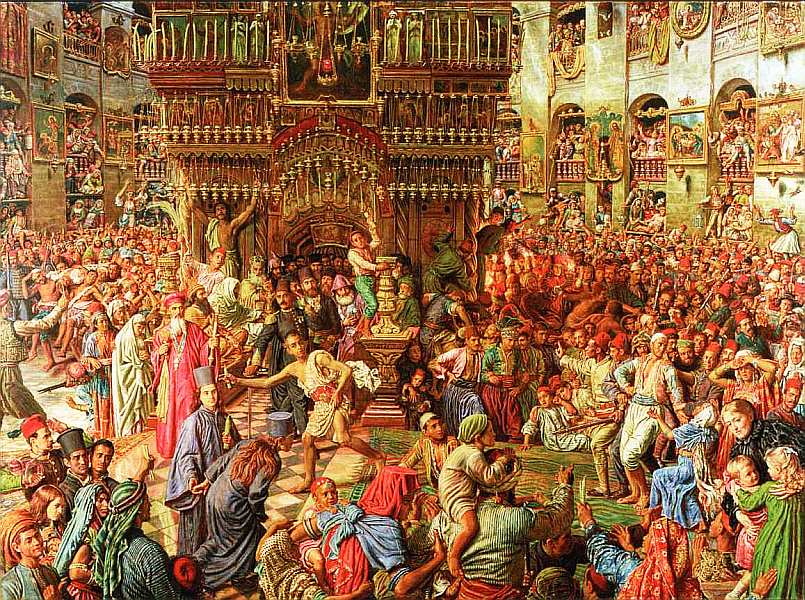 Хант изображает представителей разных конфессий и национальностей: испуганные английские протестанты, активно жестикулирующие греки, турки и даже исламский повелитель города Бим Паша в центре, олицетворяющий порядок и беспорядок. Эта картина стала своеобразным ответом мастера на дискуссии 1870-1880-х среди англикан, предлагающих объединить свою церковь с греческой, армянской, русской и другими ортодоксальными ветвями христианства. Характерная черта искусства символизма в целом возводить любое общественное событие или бытовой случай до емкой художественной метафоры.