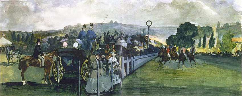 В этом произведении Мане запечатлел гонки, которые, как известно, были очень популярной темой среди французских художников-новаторов в 1860-е. Знаменитые скачки рисовал также Эдгар Дега, Пьер Боннар и многие другие мастера импрессионизма. В представленной работе Мане экспериментирует с техникой. Он рисует акварелью и более плотной по своему составу гуашью по контурам, сделанным графитом. Лист состоит из двух частей. На основной стороне скачки, на второй место для публики. Руке автора принадлежит еще несколько похожих изображений скачек, сделанных по тому же принципу складывающегося листа. Мастер строит рисунок по принципу фриза ленты, в которой основную организующую роль берет на себя стереометрическая перспектива. Мане концентрирует ощущение пространства, преодолеваемого скачущими во всю мощь лошадьми, усилив сходящиеся на горизонте линии. Обзор местности при этом становится шире, превращая небольшой рисунок в панораму. В таком интересе к проблемам передачи перспективы отчетливо видны первые признаки приближающихся экспериментов другого великого художника-новатора Поля Сезанна.