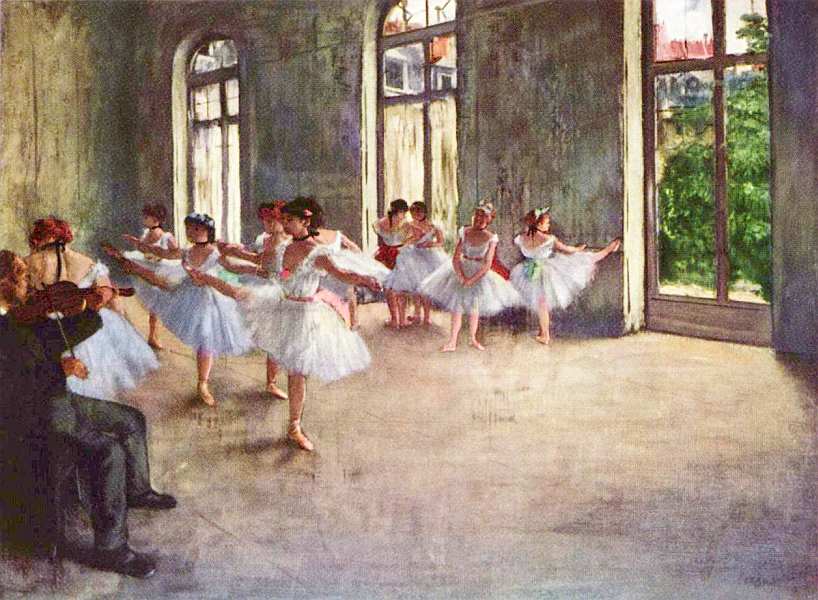 В представленной картине мастер намеренно сдвигает изображение от центра, оставляя правый фрагмент полотна незаполненным фигурами. Этим он создает особое ощущение большого пространства зала. Возникает контраст между студией и густой зеленью сада. Хорошая погода привлекает внимание художника ничуть не меньше, чем юные балерины, танцующие под аккомпанемент скрипки. Он гармонично подбирает цвета, сопоставляет коричневый и темно-зеленый, наделяя оттенки дополнительным смыслом. Немного выцветшие, блеклые, землистые бежевые тона стен и фигурок балерин будто символизируют безымянный труд, упорную репетицию девушек в одинаковых платьях. Никто из них не выделяется, они не смотрят друг на друга, не обращают внимания на живописца, они погружены в ритм танца. Аккомпаниатор-скрипач также безлик, чтобы подчеркнуть это Дега обрезает его фигуру, он едва помещается на холсте. Открытое высокое окно почти во всю стену, через которое падает рассеянный тусклый свет, придает этой небольшой картине атмосферу неприхотливого спокойствия занятых своим трудом людей.