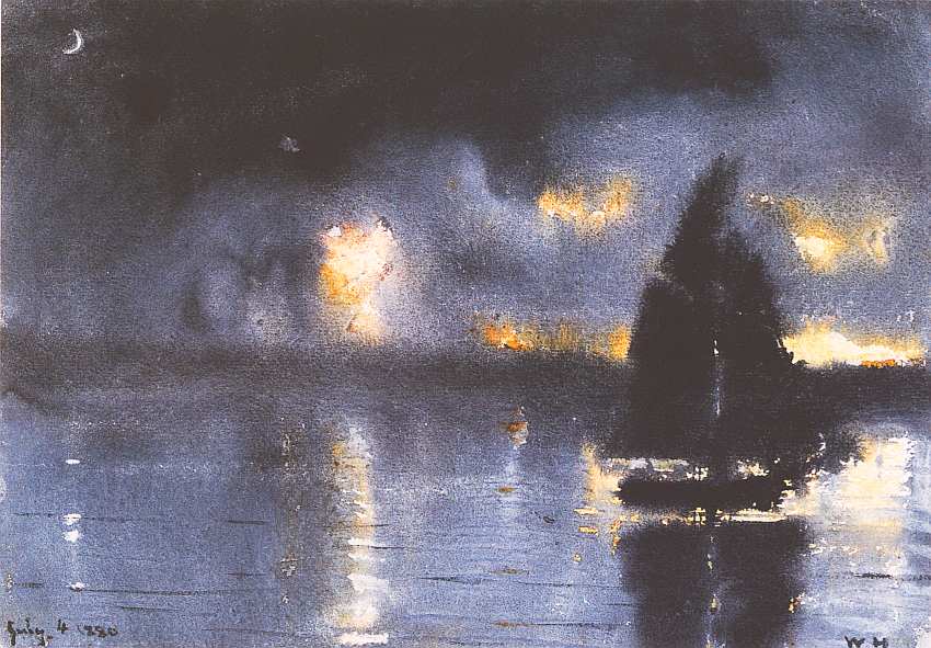 Представленная акварель относится к первому периоду творчества мастера. До начала 1880-х он отдавал предпочтение жизнерадостным пейзажам, изображал веселые, беззаботные сценки из жизни американцев. На этой небольшой картине художник исполнил вид на море во время фейерверка 4 июля один из главных праздников для американской нации День независимости Америки от Королевства Великобритании. Сюжет ночного салюта формально соответствует густому мраку ночи, в котором вспыхивают неясные огни. Работа примечательна тем, что зритель может увидеть будущую эволюцию мастера. Вскоре он откажется от оптимистичных картин, будет предпочитать достаточно мрачные, тревожные сюжеты, создавая атмосферу неустроенности, тягот жизни, неурядиц, которые преследуют человека. Черная тень скользящего в темноте парусника не создает впечатления мирной прогулки, ночной праздничной беззаботности. Мрачные тяжелые облака рифмуются с чернотой силуэта, оставляя у зрителя ощущение покинутости, одиночества или тревоги.