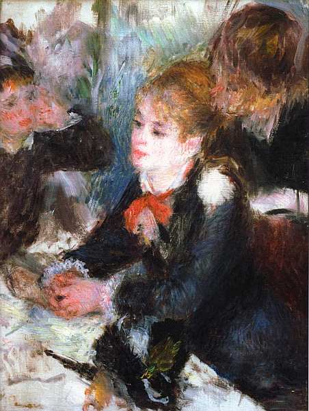 Этот портрет-зарисовка молодой девушки написан в типичной импрессионистической манере. Художника интересует задумчивый взгляд героини, который он виртуозно схватывает несколькими мазками. Немного более условно написана вторая девушка, сидящая слева, она выглядит, скорее, как статист. Стоит обратить внимание на энергию разноцветных мазков, которыми живописец создает очень интенсивную и сложную фактуру холста. При очевидной простоте сюжета фигура справа, с замазанным лицом, становится похожа на неведомое существо, это придает картине дополнительную тревожность и интригу. Данное полотно отличный пример того, что великое искусство французских импрессионистов строилось на сложности и неоднозначности изображенного мира.