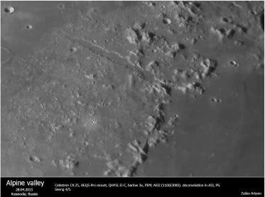 Пристального внимания заслуживает Альпийская Долина так назвал ее первооткрыватель, итальянский священник и астроном Франческо Бьянкини в далеком 1727 году. С тех пор эта лунная достопримечательность приковывает к себе внимание не только ученых, но и любителей астрономии. Благодаря своим размерам (длина 160 км, ширина средней части 10 км) Альпийская Долина один их самых легких для наблюдения лунных объектов. При удачном освещении этот разлом можно рассмотреть даже в 50-миллиметровый бинокль.