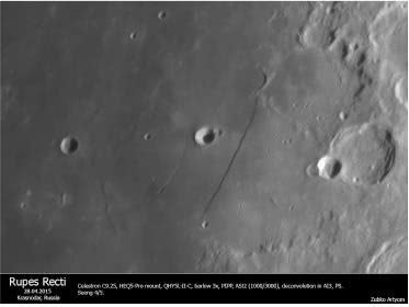 Переместимся южнее, в восточную часть Моря Облаков. Когда фаза Луны составляет примерно 8 дней после новолуния, наблюдатель без труда отыщет Прямую Стену самый известный тектонический разлом на поверхности Луны. Выглядит он как длинная и тонкая линия, простирающаяся с севера на юг почти на 120 км. Можно заметить, что не такая уж «стена» и прямая: на обоих ее концах имеются сегменты, расположенные под углом. Да и отвесной ее назвать нельзя, так как наклон склона составляет примерно 21 градус.
