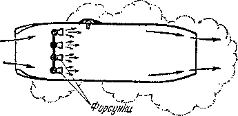 Но можно построить ВРД и без решёток это так называемый прямоточный воздушно-реактивный двигатель (ПВРД). Он имеет цилиндрический корпус (рис. 25). Переднее отверстие в корпусе несколько меньше заднего, откуда выходят реактивные газы. При большой скорости самолёта сквозь переднее отверстие врывается воздух, который служит окислителем для горючего, поступающего из форсунки. Газы, образующиеся от сгорания горючего в сильной воздушной струе, проходящей через двигатель, нагревают этот воздух, и он от этого стремится расшириться и с огромной силой вырывается через заднее отверстие двигателя. Поэтому грубо можно сказать, что тяга этого двигателя получается как бы только за счёт «разгона воздуха», который входит в двигатель и покидает его в сильно разогретом состоянии.
