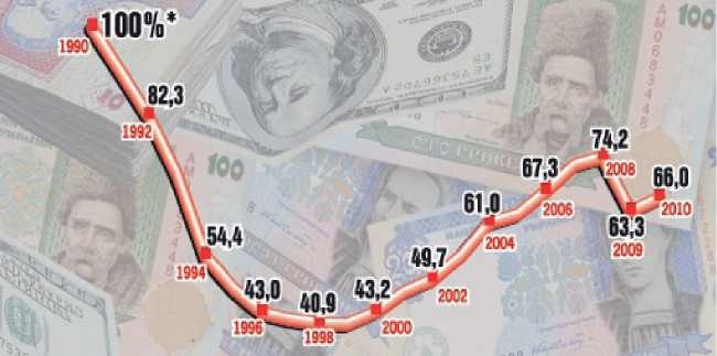 Рис. 1. Соотношение валового внутреннего продукта (ВВП) Украины с 1990 по 2010 год в процентном отношении к ВВП 1990 года [Гаценко, 2011].