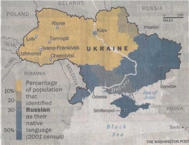 Рис. 4. Карта соотношения русскоговорящего (серый цвет) и украинско-говорящего населения Украины, 2001 год.