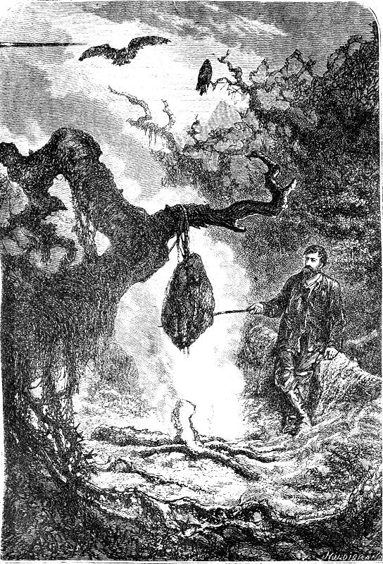 Посредством дыма мы освободились наконец от тучи докучливых мух и занялись тюленем. Это было годовалое животное, оно весило около ста кило. Кожа его, которую принес Мусграв, была покрыта короткой и гладкой шерстью коричневато цвета с серебристым отблеском. Гарри рассучил веревку на несколько концов, взял часть животного и привязал к изогнутой ветке дерева; подле повешенного куска я развел огонь и поворачивал жаркое к огню небольшой