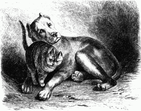 У какого-то господина жила собака Денди и кошка Пик; жили они в теснейшей дружбе. Случалось ли получать собаке подачку, она непременно делилась ею со своим другом. Они ели из одной тарелки, спали вместе и никогда не разлучались. Хозяину захотелось однажды испытать их дружбу. Он взял кошку и поручил жене наблюдать за тем, что будет делать в это время собака. Он стал угощать кошку и заметил, что, несмотря на отсутствие ее товарища, она ела с величайшим удовольствием, как бы забыв о нем. Вскоре хозяин пошел погулять, спрятав в шкаф половину тетерки, которой он хотел поужинать. Вот что рассказала ему жена по его возвращении. После его ухода кошка тотчас же отправилась к собаке и принялась громко мяукать на разные лады, собака отвечала ей односложным ворчаньем. Затем оба пошли к столовой, и, как только кто-то из детей отворил дверь, оба приятеля забрались в нее. Кошка немедленно подвела собаку к шкафу, достала тарелку, на которой лежала тетерка, схватила желанное жаркое и подала его собаке. Когда лакомый кусок был съеден, оба друга забрались под диван, выжидая, чтобы кто-нибудь отворил дверь. Хозяин вошел первый в столовую и тотчас заметил, с каким смущенным видом выбирались из нее приятели. С тех пор он стал особенно тщательно наблюдать за ними и убедился, что они всегда извещали друг друга, когда находили что-нибудь для них интересное