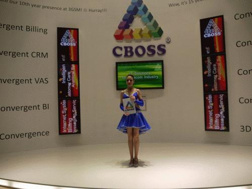 В первом павильоне я нашла экспозицию компании CBOSS. Стенд был расположен на выгодной с точки зрения привлечения посетителей проходной линии. Подходя к стенду, посреди множества людей в тёмных костюмах (ведь аудитория в основном мужская) я догнала двух девушек в ярко-синих платьях с открытыми спинами их просто нельзя было не увидеть. Замечали красавиц и посетители, и даже оглядывались на них. Девушки направлялись в одном направлении со мной на сооруженную ярко освещенную сцену стенда CBOSS! В это время на сцене в окружении таких же красавиц фотографировались хозяева стенда. В этом году ассоциация CBOSS участвовала в Mobile World Congress в десятый, юбилейный раз. Лёгкое настроение, навеянное девушками, не помешало, однако, принимать на стенде важного гостя. Николай Тимофеев, руководитель отдела маркетинга и PR CBOSS, сообщил нам, что стенд CBOSS посетила делегация во главе с целым министром связи и массовых коммуникаций Игорем Щёголевым.